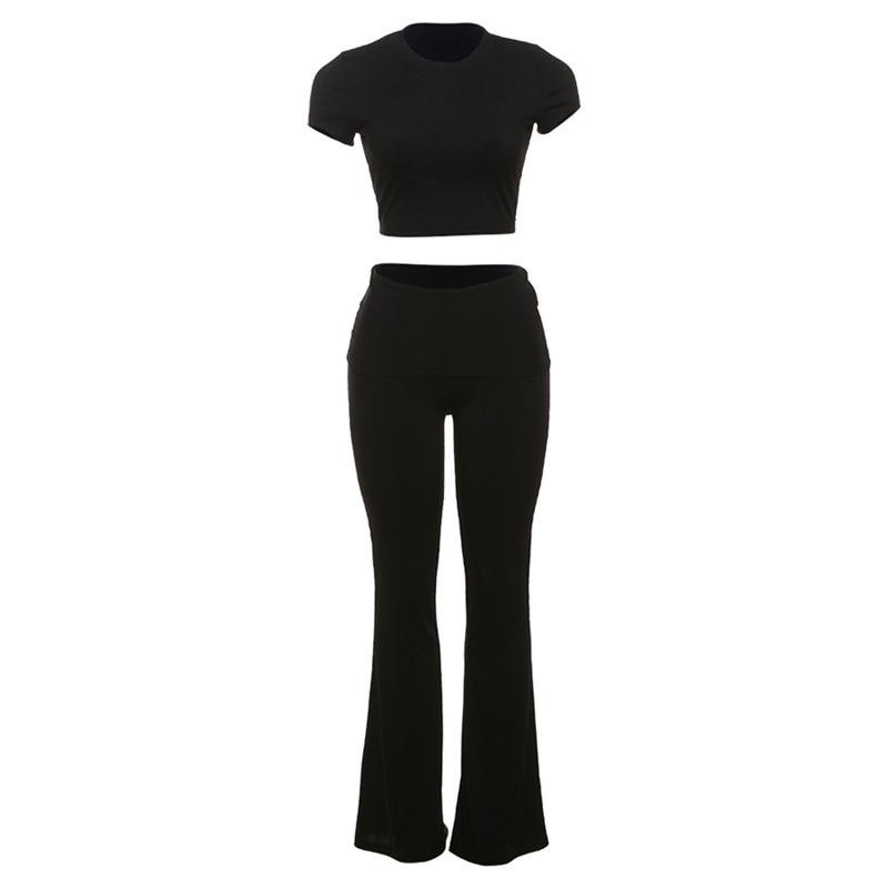 Spring New Arrivals Solid Color Women Two Piece Set Short Sleeve Crop Top Flare Pants Streetwear Set Clothing
